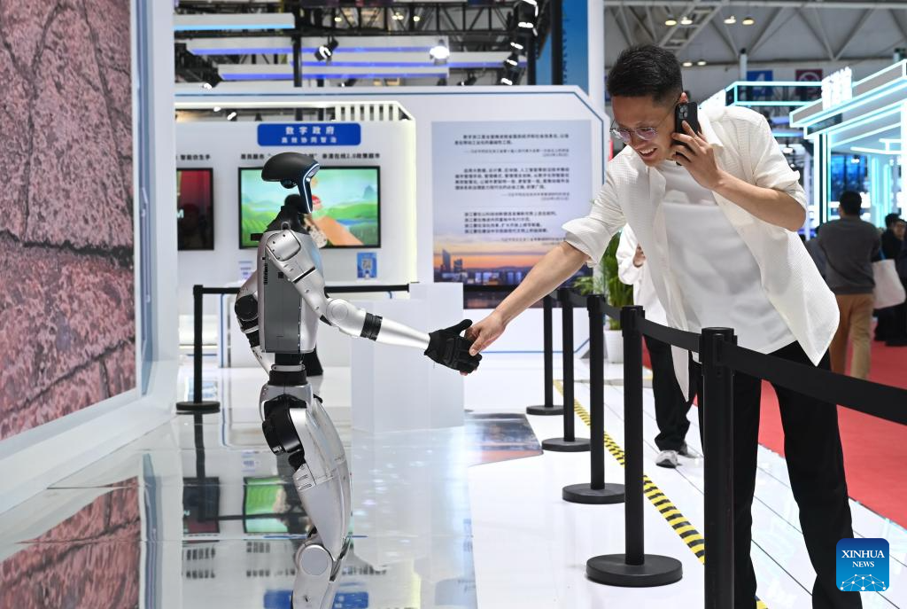 FUZHOU, 28 abril, 2025 (Xinhua) -- Un visitante interactúa con un robot humanoide en la zona de experiencias de la VIII Cumbre China Digital, en Fuzhou, en la provincia de Fujian, en el sureste de China, el 28 de abril de 2025. Con la asistencia de más de 300 instituciones profesionales, la VIII Cumbre China Digital abrió su zona de experiencias a los visitantes profesionales el lunes, mostrando los logros de la transformación digital del país en medio de un sólido crecimiento en el sector digital. (Xinhua/Lin Shanchuan)