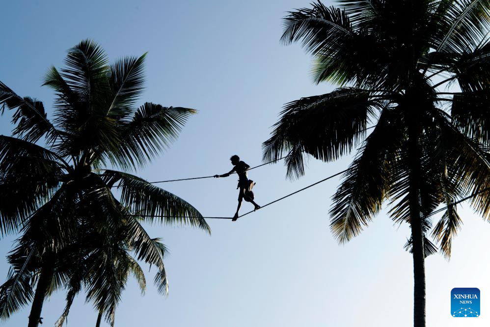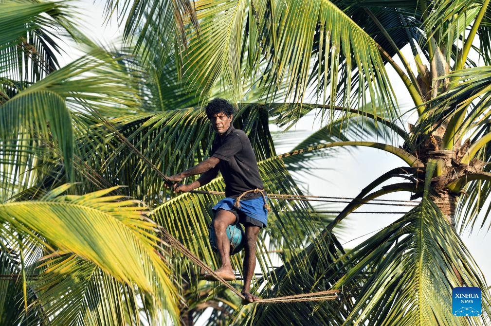 NEGOMBO, 28 abril, 2025 (Xinhua) -- Imagen del 26 de abril de 2025 de un trabajador caminando sobre una cuerda entre dos cocoteros para recolectar savia, en Negombo, a unos 30 km al norte de Colombo, Sri Lanka. (Xinhua/Ajith Perera)