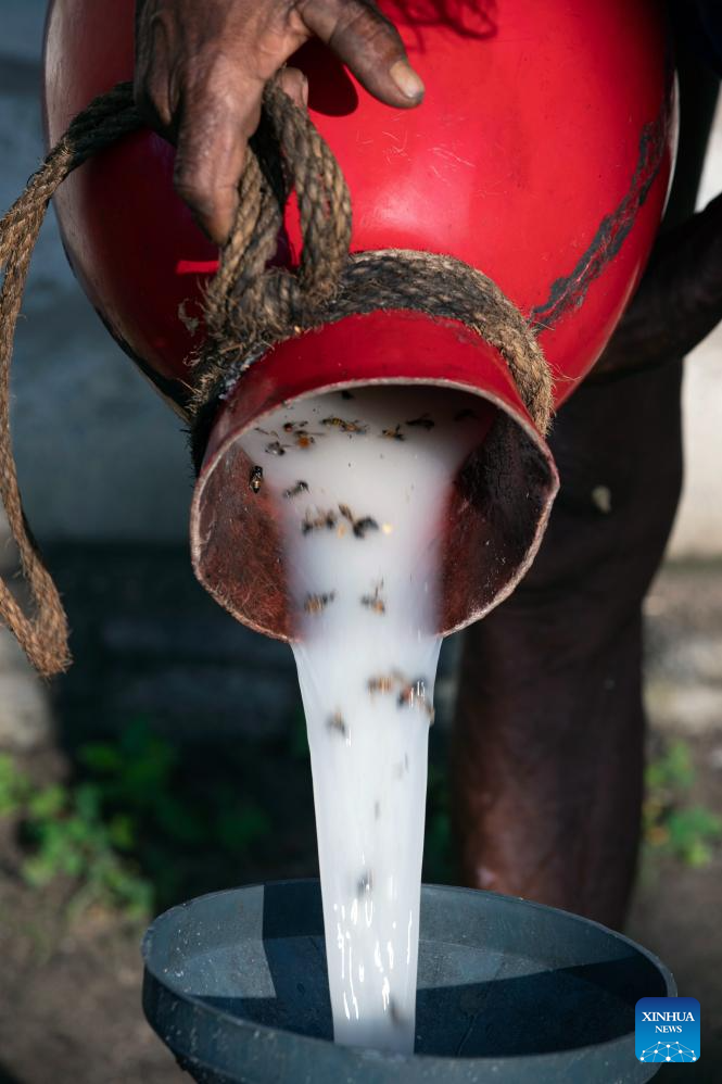 NEGOMBO, 28 abril, 2025 (Xinhua) -- Imagen del 26 de abril de 2025 de un trabajador vertiendo savia de coco, en Negombo, a unos 30 km al norte de Colombo, Sri Lanka. (Xinhua/Ajith Perera)