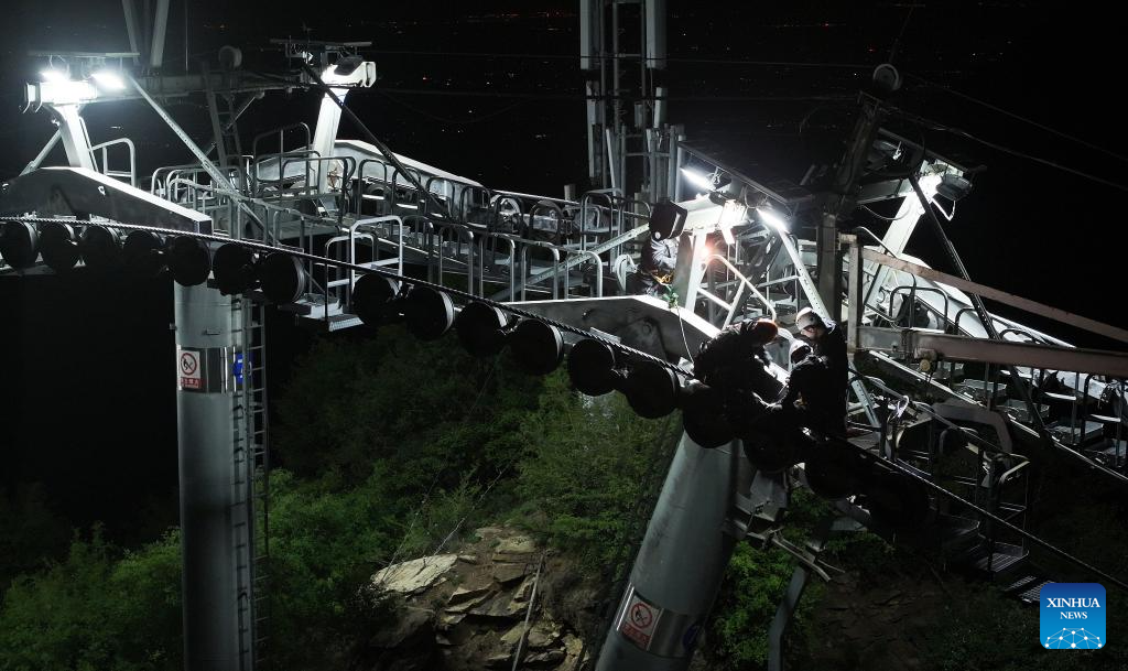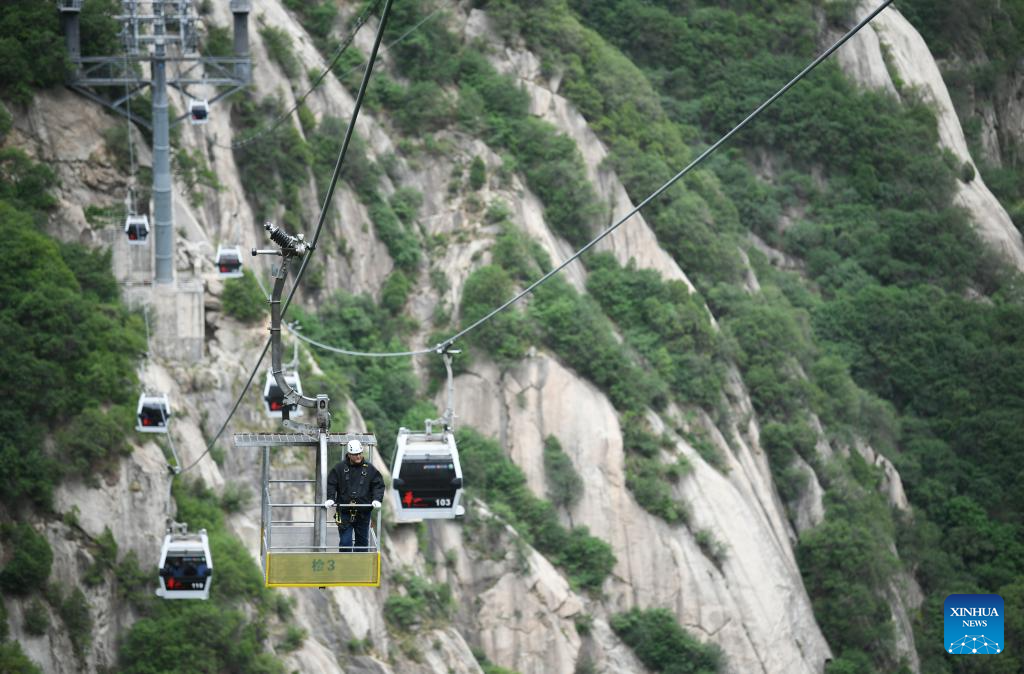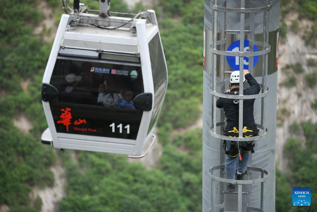 WEINAN, 30 abril, 2025 (Xinhua) -- Imagen del 29 de abril de 2025 de un trabajador de mantenimiento realizando una inspección de rutina en el teleférico turístico en el área escénica de la montaña Huashan, en Weinan, en la provincia de Shaanxi, en el noroeste de China. Con una diferencia de elevación máxima de casi 900 metros, el teleférico turístico de 4.211 metros de longitud de la montaña ha proporcionado una experiencia de viaje única para los turistas y ha ganado popularidad desde su inauguración en 2013. (Xinhua/Zhang Bowen)