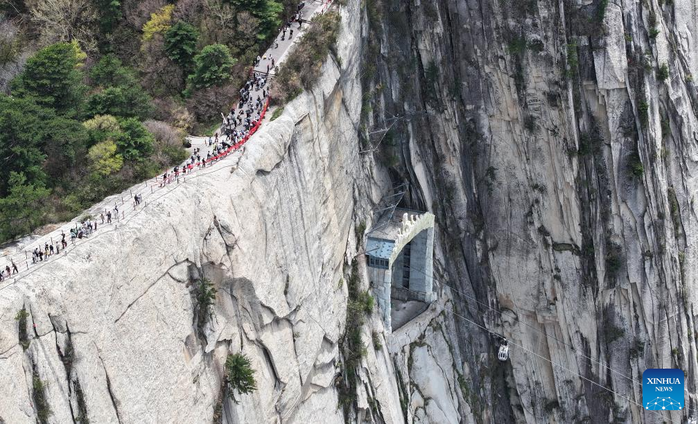 WEINAN, 30 abril, 2025 (Xinhua) -- Vista aérea tomada con un dron el 29 de abril de 2025 de un teleférico saliendo de una estación en el área escénica de la montaña Huashan, en Weinan, en la provincia de Shaanxi, en el noroeste de China. Con una diferencia de elevación máxima de casi 900 metros, el teleférico turístico de 4.211 metros de longitud de la montaña ha proporcionado una experiencia de viaje única para los turistas y ha ganado popularidad desde su inauguración en 2013. (Xinhua/Zhang Bowen)