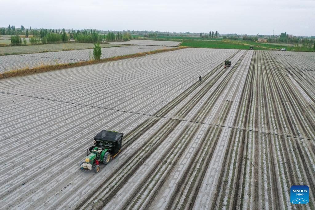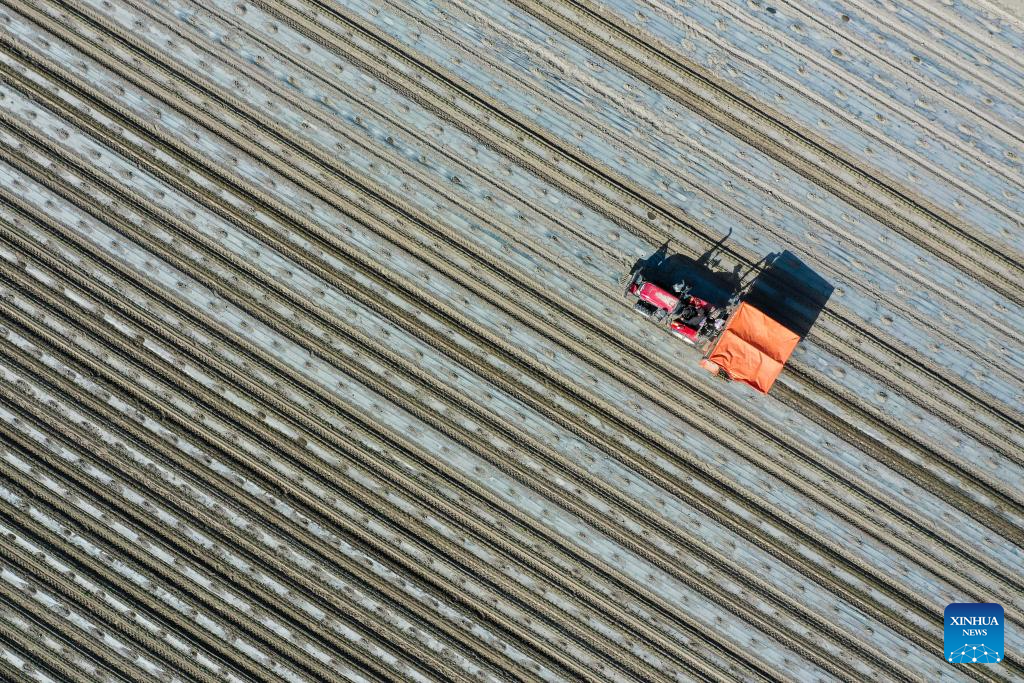URUMQI, 30 abril, 2025 (Xinhua) -- Vista aérea tomada con un dron el 28 de abril de 2025 de una máquina trasplantadora trabajando en un campo de pimiento rojo, en el poblado de Bumbut, en la prefectura autónoma mongola de Bayingolin, en la región autónoma uygur de Xinjiang, en el noroeste de China. La aplicación de equipos mecanizados, inteligentes y automatizados mejora la eficiencia de la plantación local de tomate y pimiento rojo. (Xinhua/Ding Lei)