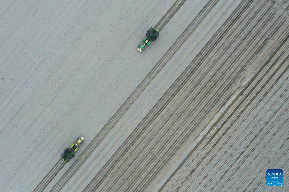 URUMQI, 30 abril, 2025 (Xinhua) -- Vista aérea tomada con un dron el 26 de abril de 2025 de máquinas trasplantadoras trabajando en un campo de tomates, en el distrito autónomo hui de Yanqi, en la prefectura autónoma mongola de Bayingolin, en la región autónoma uygur de Xinjiang, en el noroeste de China. La aplicación de equipos mecanizados, inteligentes y automatizados mejora la eficiencia de la plantación local de tomate y pimiento rojo. (Xinhua/Ding Lei)