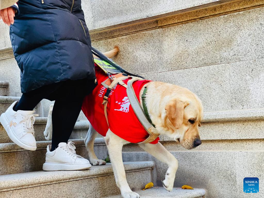 DALIAN, 30 abril, 2025 (Xinhua) -- Imagen de archivo de 2024 de un entrenador del Centro de Entrenamiento de Perros Guía de China enseñando a un perro guía cómo ayudar a su dueño a bajar las escaleras, en Dalian, en la provincia de Liaoning, en el noreste de China. Ya sea recorriendo las calles bulliciosas, abriéndose paso en el abarrotado metro o paseando por los tranquilos parques de Beijing, Wang Zhihua siempre va acompañado de un labrador con un chaleco rojo brillante. El Día Internacional del Perro Guía se celebra el último miércoles de abril de cada año, en homenaje al papel fundamental que desempeñan los perros guía en el apoyo a la independencia y la movilidad de las personas con discapacidad visual. (Xinhua/Centro de Entrenamiento de Perros Guía de China)