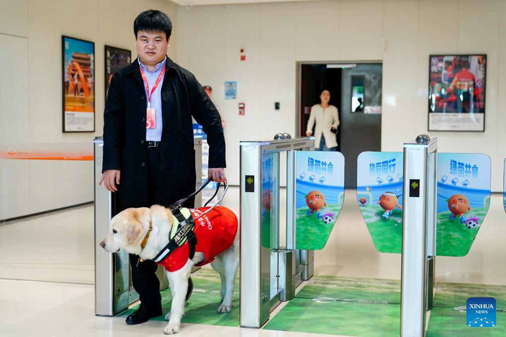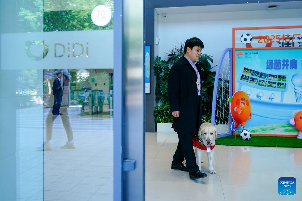 DALIAN, 30 abril, 2025 (Xinhua) -- Imagen del 25 de abril de 2025 de la perra guía Mango guiando a Wang Zhihua al trabajo, en Beijing, capital de China. Ya sea recorriendo las calles bulliciosas, abriéndose paso en el abarrotado metro o paseando por los tranquilos parques de Beijing, Wang Zhihua siempre va acompañado de un labrador con un chaleco rojo brillante. El Día Internacional del Perro Guía se celebra el último miércoles de abril de cada año, en homenaje al papel fundamental que desempeñan los perros guía en el apoyo a la independencia y la movilidad de las personas con discapacidad visual. (Xinhua/Wang Zhihua)