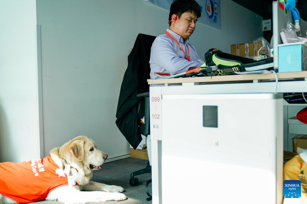 DALIAN, 30 abril, 2025 (Xinhua) -- Imagen del 25 de abril de 2025 de la perra guía Mango permaneciendo al lado de Wang Zhihua mientras trabaja en la oficina, en Beijing, capital de China. Ya sea recorriendo las calles bulliciosas, abriéndose paso en el abarrotado metro o paseando por los tranquilos parques de Beijing, Wang Zhihua siempre va acompañado de un labrador con un chaleco rojo brillante. El Día Internacional del Perro Guía se celebra el último miércoles de abril de cada año, en homenaje al papel fundamental que desempeñan los perros guía en el apoyo a la independencia y la movilidad de las personas con discapacidad visual. (Xinhua/Wang Zhihua)