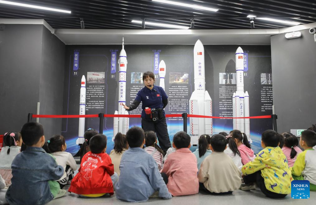 HEBI, 30 abril, 2025 (Xinhua) -- Imagen del 21 de abril de 2025 de una docente introduciendo el conocimiento sobre cohetes en una base de divulgación científica aeroespacial en un parque industrial de fabricación de satélites, en Hebi, en la provincia de Henan, en el centro de China. En los últimos años, la provincia de Henan ha desarrollado activamente la industria aeroespacial comercial, fomentando un clúster integral de la industria satelital y desarrollando industrias de apoyo relacionadas. (Xinhua/Du Xiaoyi)