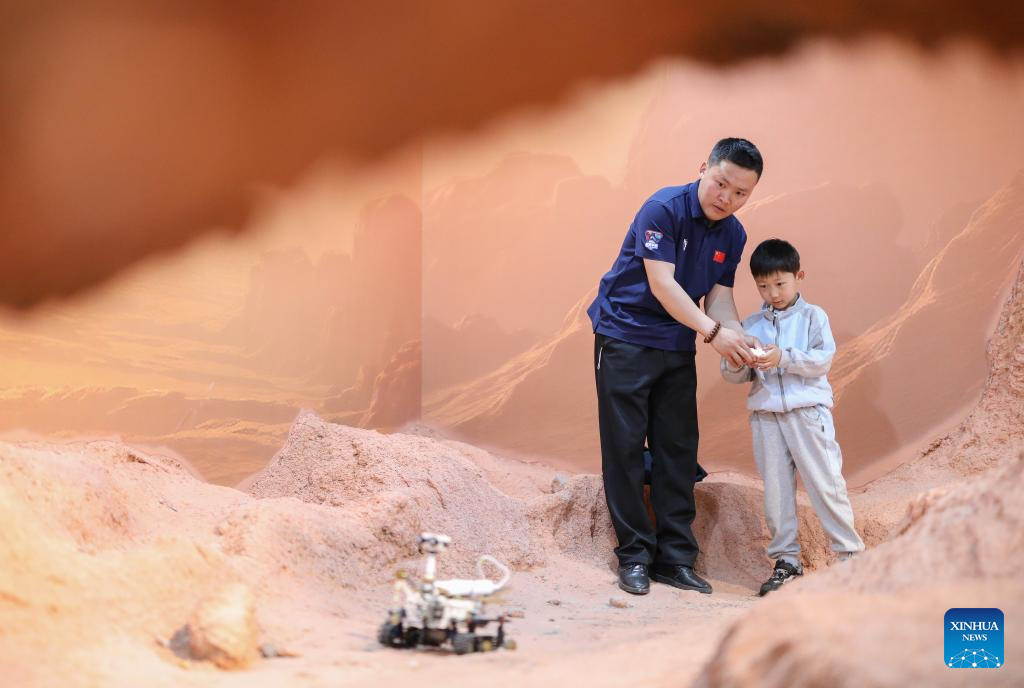 HEBI, 30 abril, 2025 (Xinhua) -- Imagen del 21 de abril de 2025 de un niño probando un módulo explorador de Marte bajo la guía de un docente en una base de divulgación científica aeroespacial en un parque industrial de fabricación de satélites, en Hebi, en la provincia de Henan, en el centro de China. En los últimos años, la provincia de Henan ha desarrollado activamente la industria aeroespacial comercial, fomentando un clúster integral de la industria satelital y desarrollando industrias de apoyo relacionadas. (Xinhua/Du Xiaoyi)