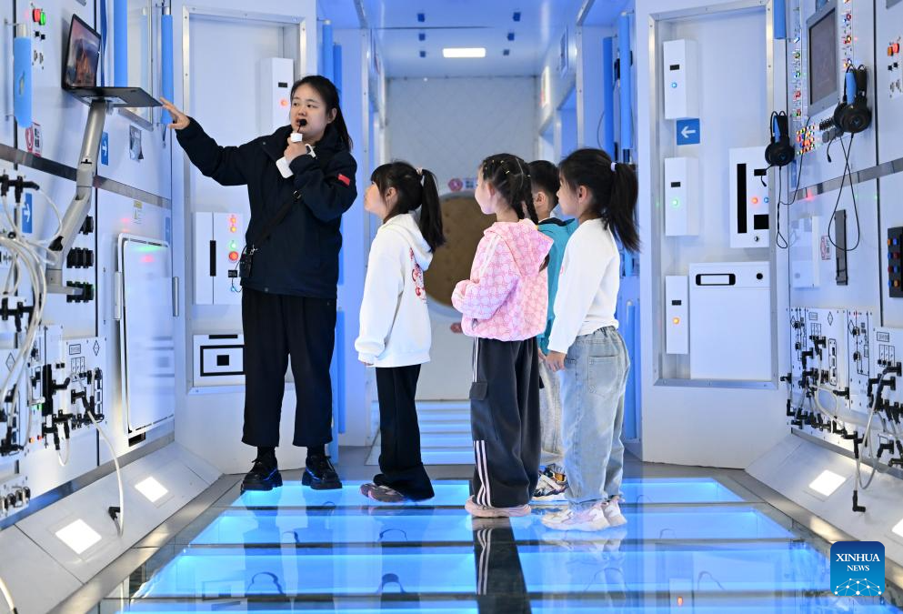 HEBI, 30 abril, 2025 (Xinhua) -- Imagen del 21 de abril de 2025 de niños visitando un modelo de una estación espacial en una base de divulgación científica aeroespacial en un parque industrial de fabricación de satélites, en Hebi, en la provincia de Henan, en el centro de China. En los últimos años, la provincia de Henan ha desarrollado activamente la industria aeroespacial comercial, fomentando un clúster integral de la industria satelital y desarrollando industrias de apoyo relacionadas. (Xinhua/Li Jianan)