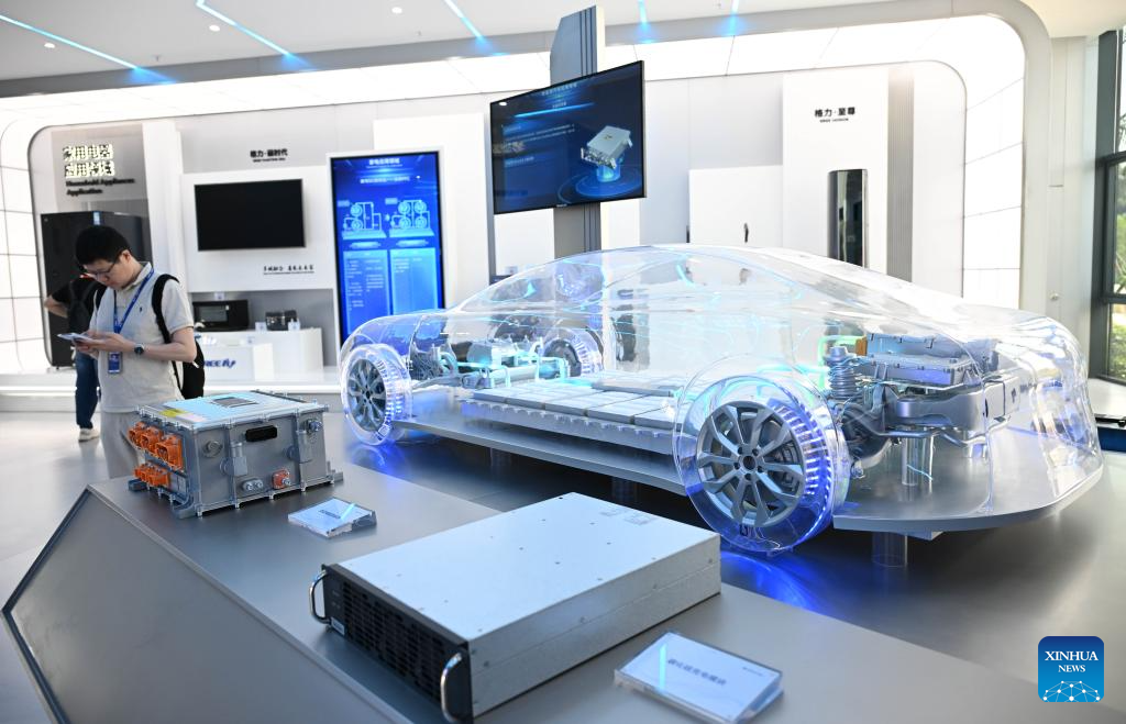 ZHUHAI, 30 abril, 2025 (Xinhua) -- Imagen del 29 de abril de 2025 de módulos de carga de carburo de silicio y un controlador de motor de tracción para Vehículos de Nueva Energía vistos en una empresa de Gree Electric Appliances Inc. de Zhuhai, en la provincia de Guangdong, en el sur de China. En los últimos años, Zhuhai ha introducido una serie de medidas para fortalecer el apoyo a las empresas privadas, que abarcan créditos financieros, protección de la propiedad intelectual y servicios gubernamentales. (Xinhua/Deng Hua)