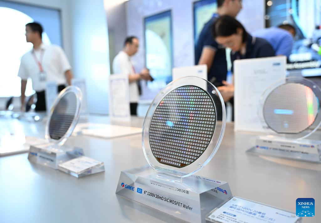 ZHUHAI, 30 abril, 2025 (Xinhua) -- Imagen del 29 de abril de 2025 de obleas de carburo de silicio de seis pulgadas vistas en una empresa de Gree Electric Appliances Inc. de Zhuhai, en la provincia de Guangdong, en el sur de China. En los últimos años, Zhuhai ha introducido una serie de medidas para fortalecer el apoyo a las empresas privadas, que abarcan créditos financieros, protección de la propiedad intelectual y servicios gubernamentales. (Xinhua/Deng Hua)