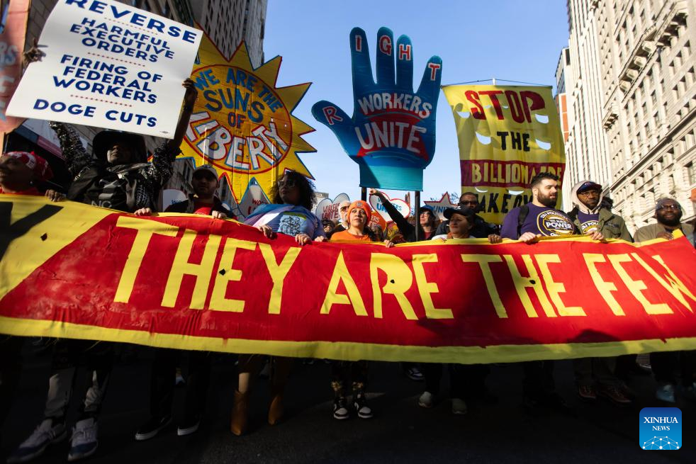 NUEVA YORK, 2 mayo, 2025 (Xinhua) -- Imagen del 1 de mayo de 2025 de personas participando en una manifestación, en la Ciudad de Nueva York, Estados Unidos. Miles de manifestantes se congregaron el jueves en la plaza Foley del Bajo Manhattan, durante las manifestaciones del Primero de Mayo, para protestar contra las iniciativas de la Administración del presidente estadounidense, Donald Trump, sobre economía, inmigración, educación o derechos de los trabajadores, entre otras. (Xinhua/Liu Yanan)