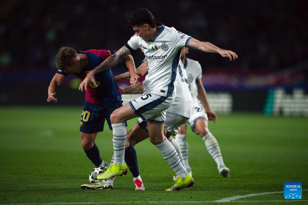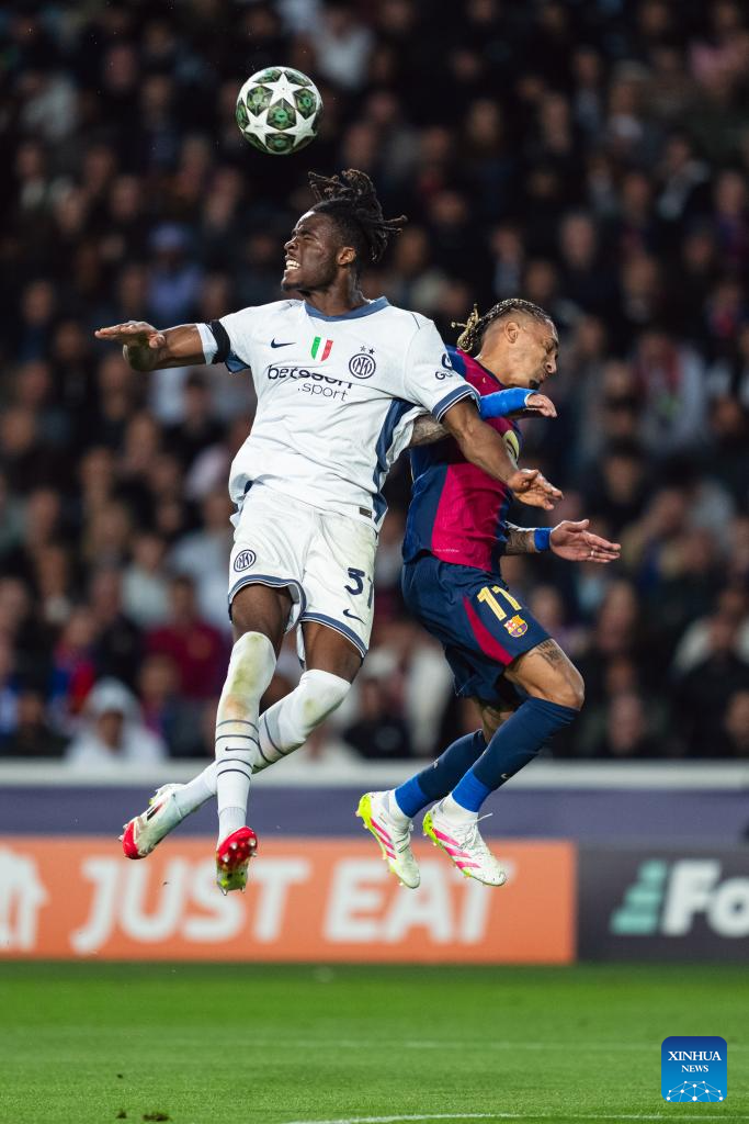 BARCELONA, 1 mayo, 2025 (Xinhua) -- Imagen del 30 de abril de 2025 de Raphinha (d), de FC Barcelona, disputando el balón con Yann Bisseck, de Inter de Milán, durante la semifinal de ida de la Liga de Campeones de la UEFA entre FC Barcelona e Inter de Milán, en Barcelona, España. (Xinhua/Joan Gosa)