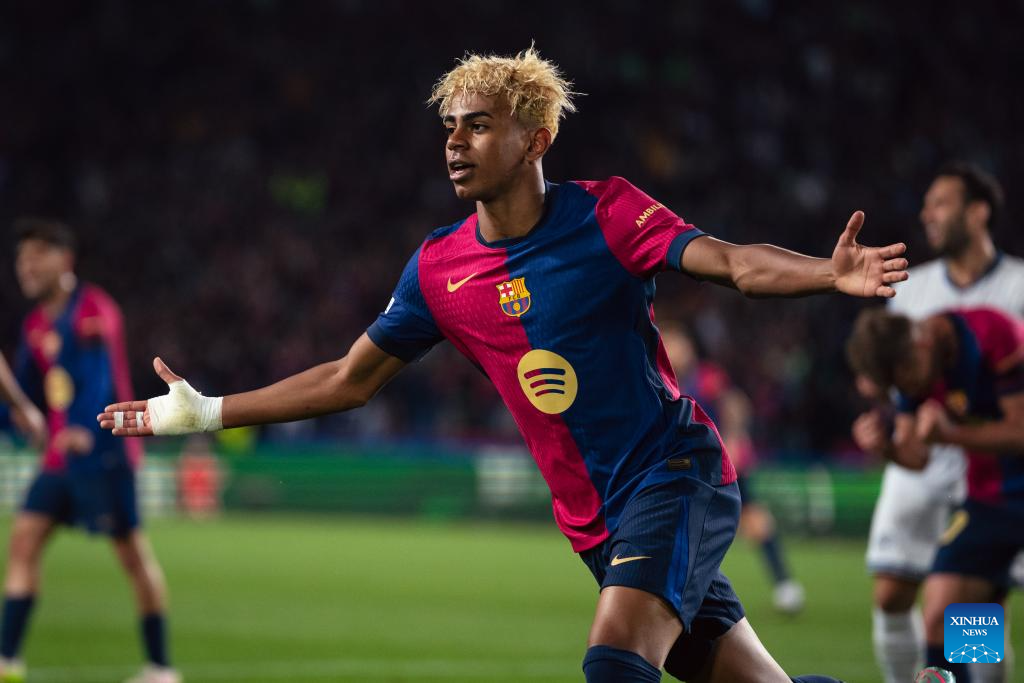 BARCELONA, 1 mayo, 2025 (Xinhua) -- Imagen del 30 de abril de 2025 de Lamine Yamal, de FC Barcelona, festejando una anotación durante la semifinal de ida de la Liga de Campeones de la UEFA entre FC Barcelona e Inter de Milán, en Barcelona, España. (Xinhua/Joan Gosa)
