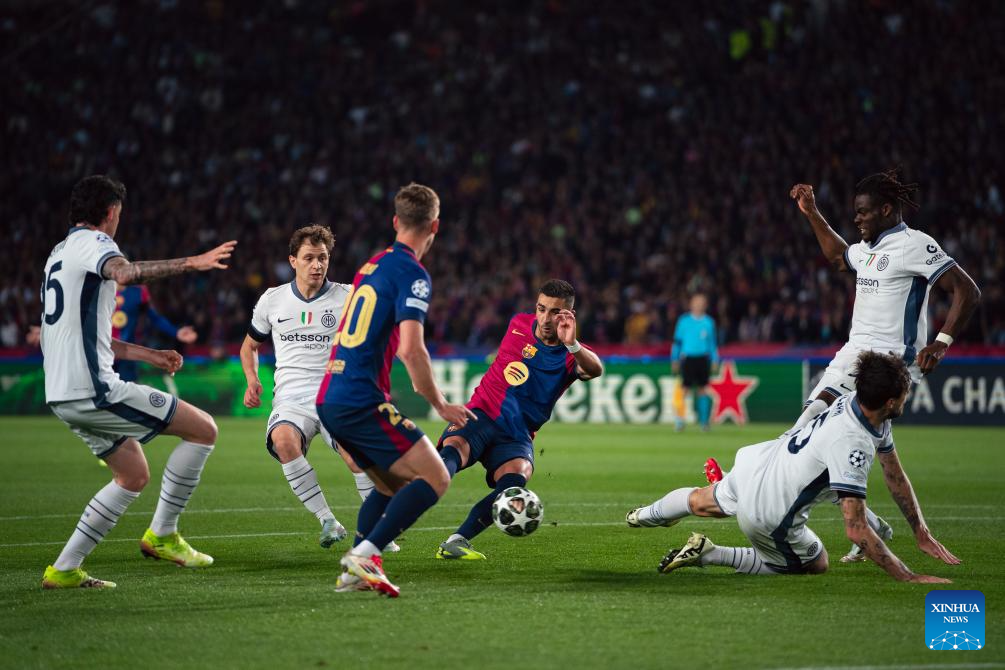 BARCELONA, 1 mayo, 2025 (Xinhua) -- Imagen del 30 de abril de 2025 de Ferran Torres (3-d), de FC Barcelona, disparando el balón durante la semifinal de ida de la Liga de Campeones de la UEFA entre FC Barcelona e Inter de Milán, en Barcelona, España. (Xinhua/Joan Gosa)