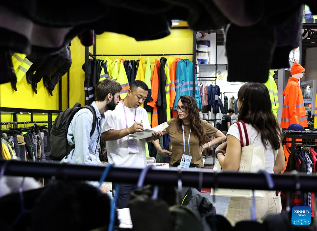 Clientes conversan con un expositor en un estand de ropa en la 137ª Feria de Importación y Exportación de China, en Guangzhou, en la provincia de Guangdong, en el sur de China, el 5 de mayo de 2025. La 137ª Feria de Importación y Exportación de China, también conocida como Feria de Cantón, concluyó el lunes en la provincia meridional china de Guangdong, y los organizadores anunciaron la participación de más de 288.000 compradores extranjeros. (Xinhua/Huang Guobao)