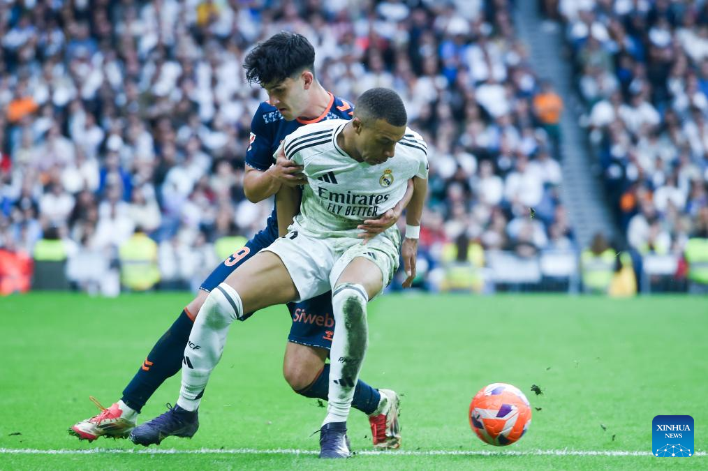 MADRID, 5 mayo, 2025 (Xinhua) -- Imagen del 4 de mayo de 2025 de Kylian Mbappe (d), de Real Madrid, disputando el balón con Yoel Lago, de RC Celta, durante el partido de fútbol de la LaLiga entre Real Madrid y RC Celta, en el Estadio Santiago Bernabéu, en Madrid, España. (Xinhua/Gustavo Valiente)