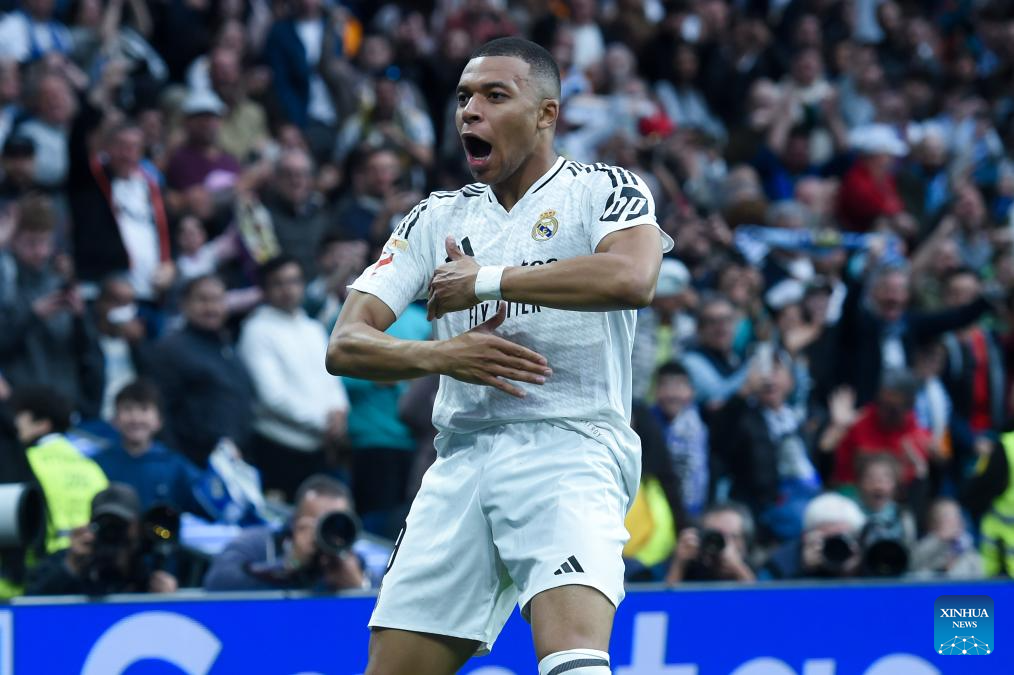 MADRID, 5 mayo, 2025 (Xinhua) -- Imagen del 4 de mayo de 2025 de Kylian Mbappe, de Real Madrid, festejando su anotación durante el partido de fútbol de la LaLiga entre Real Madrid y RC Celta, en el Estadio Santiago Bernabéu, en Madrid, España. (Xinhua/Gustavo Valiente)