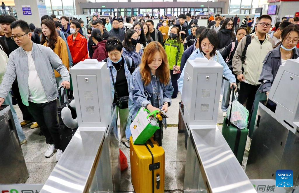 BEIJING, 5 mayo, 2025 (Xinhua) -- Pasajeros desembarcan en la Estación de Ferrocarriles de Jinhua, en Jinhua, en la provincia de Zhejiang, en el este de China, el 5 de mayo de 2025. En el último día del feriado del Primero de Mayo, se observó un pico en los viajes de regreso en todo el país. (Xinhua/Hu Xiaofei)