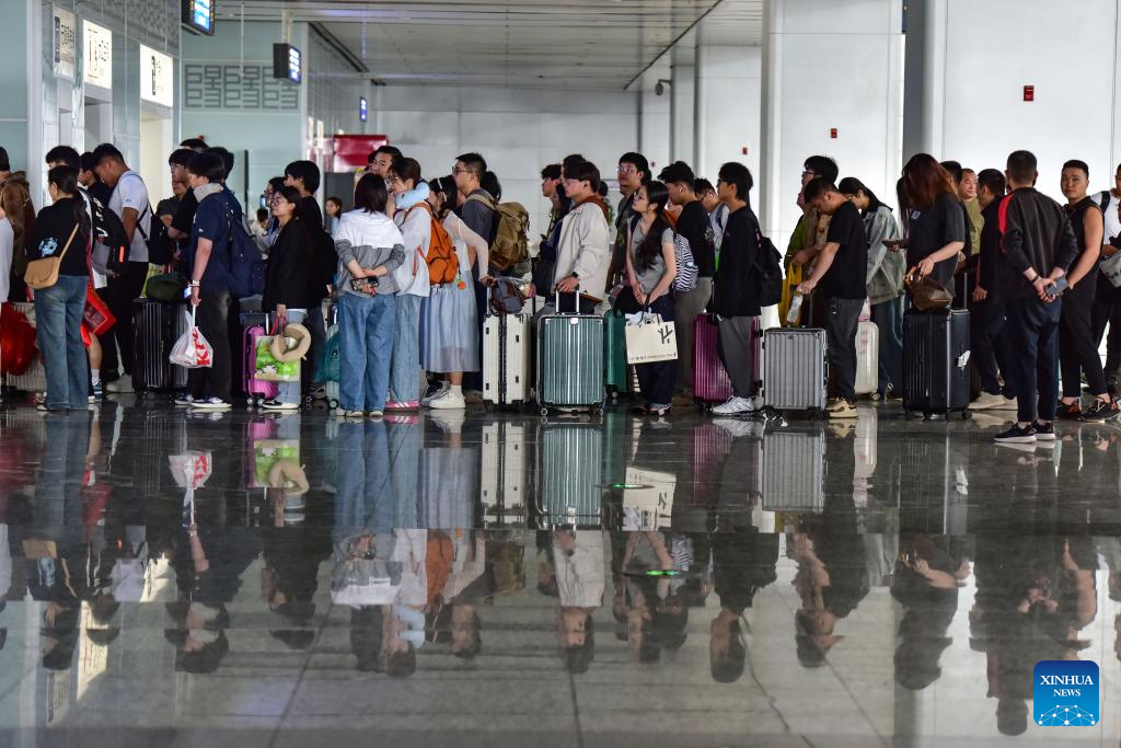 BEIJING, 5 mayo, 2025 (Xinhua) -- Pasajeros esperan el registro de sus boletos en la Estación de Ferrocarriles del Oeste de Fuyang, en Fuyang, en la provincia de Anhui, en el este de China, el 5 de mayo de 2025. En el último día del feriado del Primero de Mayo, se observó un pico en los viajes de regreso en todo el país. (Xinhua/Lu Qijian)