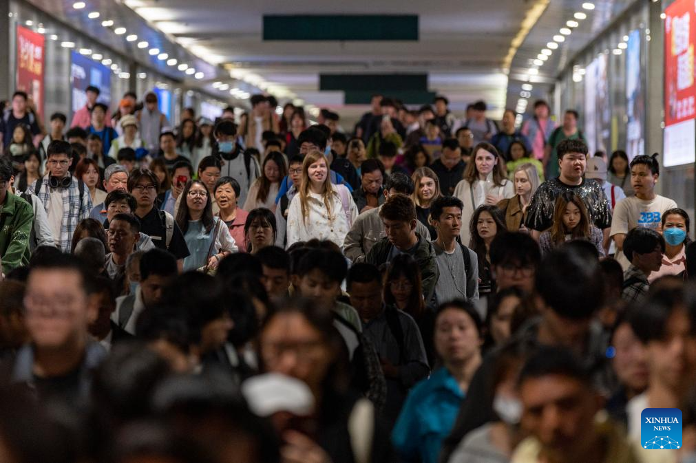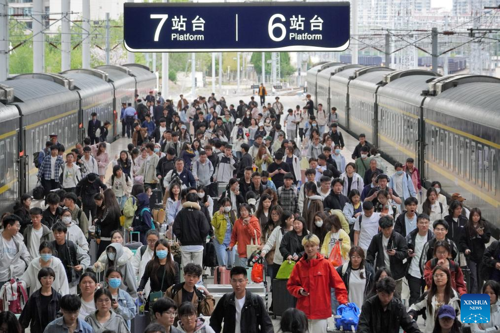 BEIJING, 5 mayo, 2025 (Xinhua) -- Pasajeros desembarcan en la Estación de Ferrocarriles de Harbin, en Harbin, en la provincia de Heilongjiang, en el noreste de China, el 5 de mayo de 2025. En el último día del feriado del Primero de Mayo, se observó un pico en los viajes de regreso en todo el país. (Xinhua/Yuan Yong)