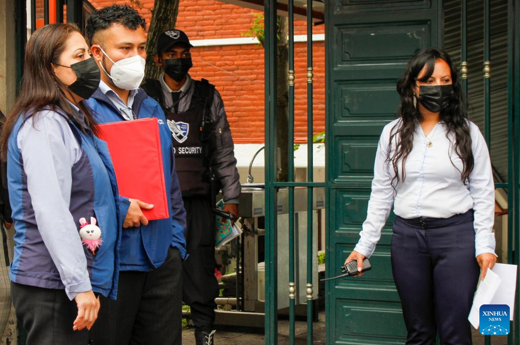 Personal de una unidad educativa revisan el uso de mascarillas por parte de los estudiantes como medida de prevención por la alerta epidemiológica generada tras el aumento de casos de tos ferina, en Quito, capital de Ecuador, el 5 de mayo de 2025. (Xinhua/Ricardo Landeta)