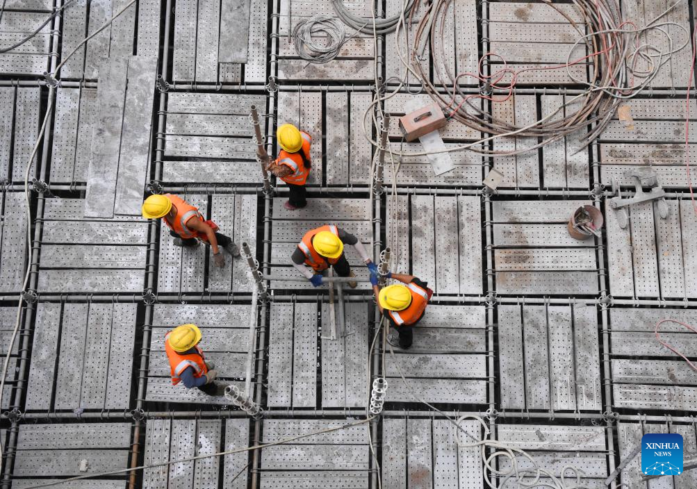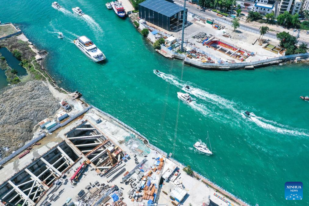 SANYA, 5 mayo, 2025 (Xinhua) -- Trabajadores laboran en el sitio de construcción del proyecto de paso del estuario del río Sanya, en Sanya, en la provincia de Hainan, en el sur de China, el 5 de mayo de 2025. Como el primer túnel submarino en Sanya, el proyecto emprendido por el Grupo de la Oficina 20 de Ferrocarriles de China, está logrando un progreso constante. Una vez finalizado, optimizará aún más la distribución espacial de la ciudad de Sanya. (Xinhua/Zhao Yingquan)