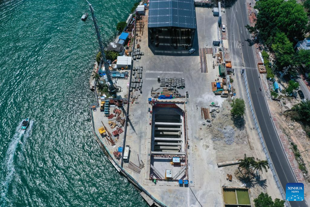SANYA, 5 mayo, 2025 (Xinhua) -- Vista aérea tomada con un dron el 5 de mayo de 2025 del sitio de construcción del proyecto de paso del estuario del río Sanya, en Sanya, en la provincia de Hainan, en el sur de China. Como el primer túnel submarino en Sanya, el proyecto emprendido por el Grupo de la Oficina 20 de Ferrocarriles de China, está logrando un progreso constante. Una vez finalizado, optimizará aún más la distribución espacial de la ciudad de Sanya. (Xinhua/Zhao Yingquan)