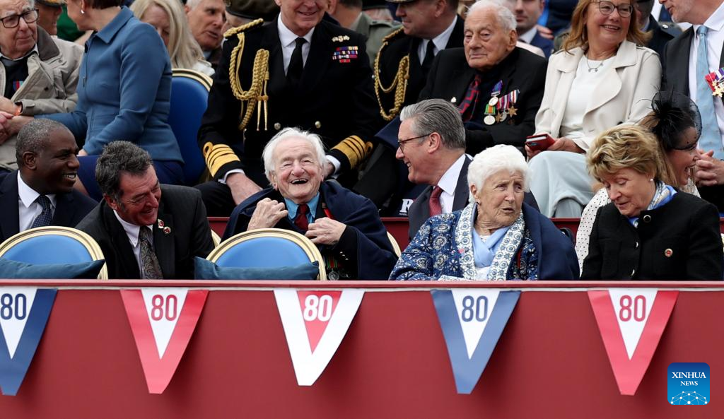 LONDRES, 6 mayo, 2025 (Xinhua) -- Imagen del 5 de mayo de 2025 del primer ministro británico, Keir Starmer (4-i-frente), conversando con un veterano durante la procesión militar, en Londres, Reino Unido. Reino Unido realizó procesiones militares y un sobrevuelo de la Real Fuerza Aérea el lunes para conmemorar el 80 aniversario del Día de la Victoria en Europa. (Xinhua/Li Ying)