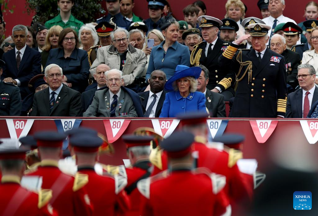 LONDRES, 6 mayo, 2025 (Xinhua) -- Imagen del 5 de mayo de 2025 de una procesión militar llevándose a cabo, en Londres, Reino Unido. Reino Unido realizó procesiones militares y un sobrevuelo de la Real Fuerza Aérea el lunes para conmemorar el 80 aniversario del Día de la Victoria en Europa. (Xinhua/Li Ying)