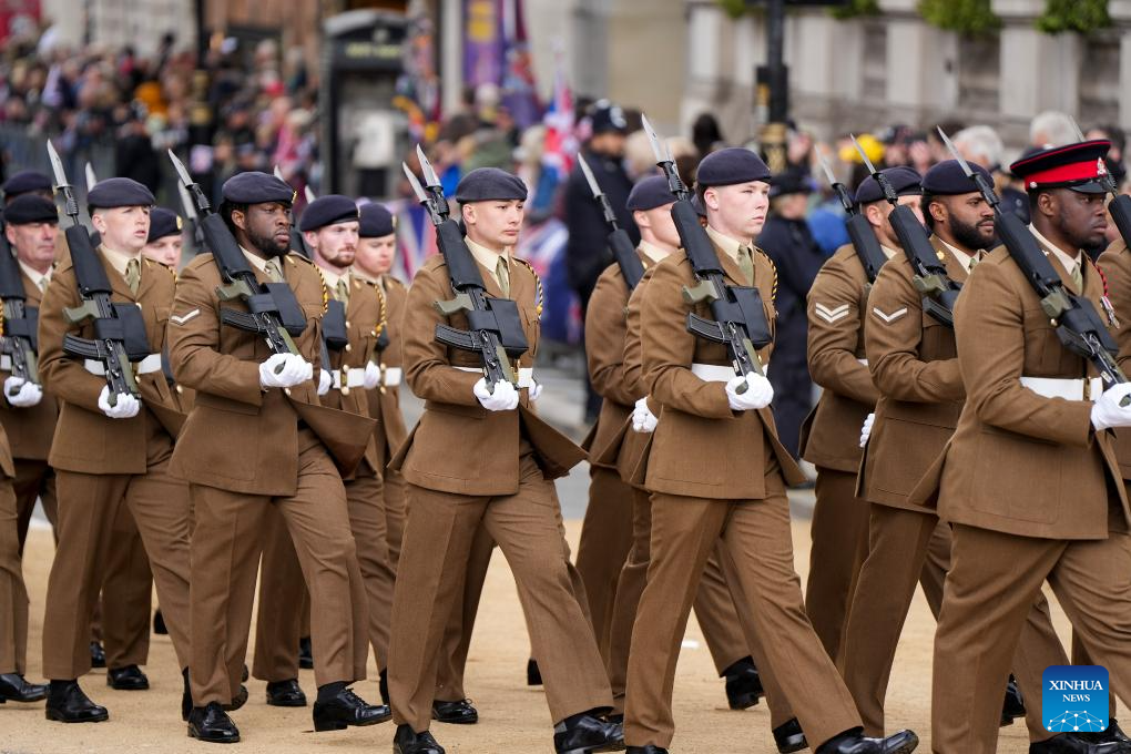 LONDRES, 6 mayo, 2025 (Xinhua) -- Imagen del 5 de mayo de 2025 de miembros de las fuerzas armadas para la procesión militar caminando por el Palacio de Buckingham, en Londres, Reino Unido. Reino Unido realizó procesiones militares y un sobrevuelo de la Real Fuerza Aérea el lunes para conmemorar el 80 aniversario del Día de la Victoria en Europa. (Xinhua/Li Ying)