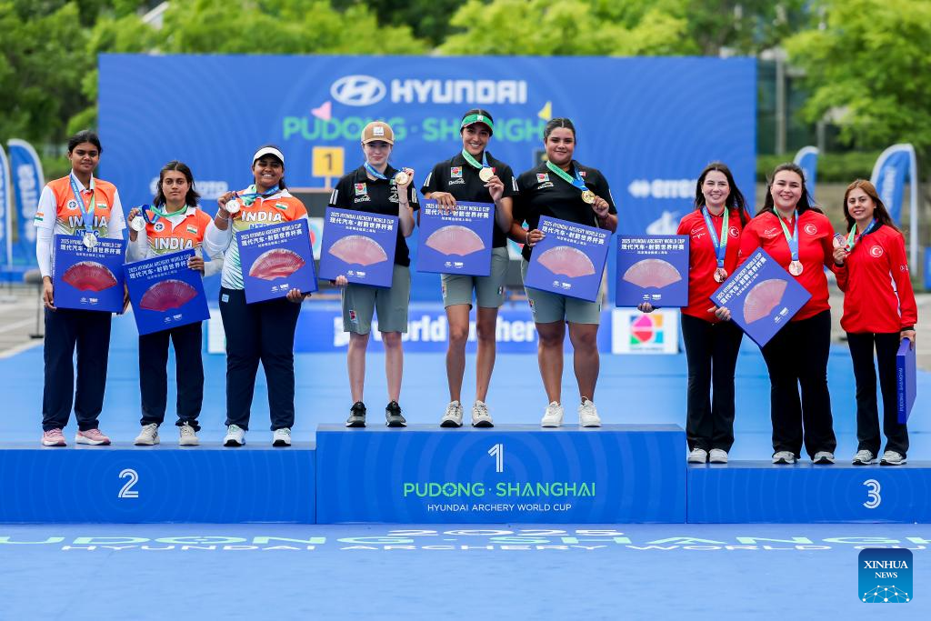 SHANGHAI, 10 mayo, 2025 (Xinhua) -- (De izq. a der.) Las medallistas de plata del equipo de India, las medallistas de oro del equipo de México y las medallistas de bronce del equipo de Turquía, posan durante la ceremonia de premiación de la competencia de compuesto femenino por equipos en la etapa 2 de la Copa del Mundo de Tiro con Arco de Shanghai 2025, en Shanghai, China, el 10 de mayo de 2025. (Xinhua/Wang Xiang)