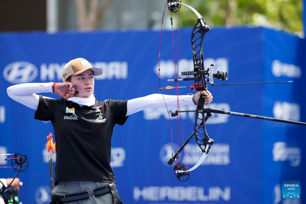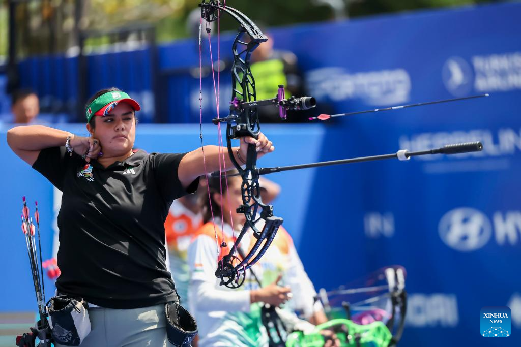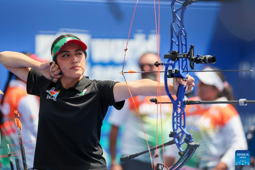 SHANGHAI, 10 mayo, 2025 (Xinhua) -- Mariana Bernal, de México, compite durante la final por la medalla de oro de la competencia de compuesto femenino por equipos en la etapa 2 de la Copa del Mundo de Tiro con Arco de Shanghai 2025, en Shanghai, China, el 10 de mayo de 2025. (Xinhua/Wang Xiang)