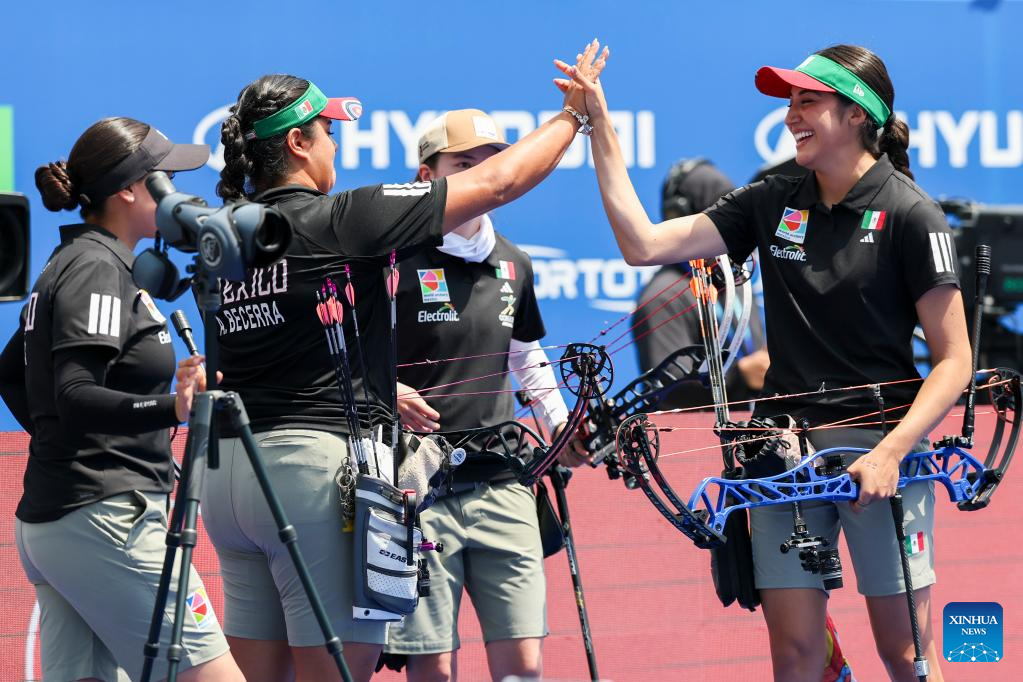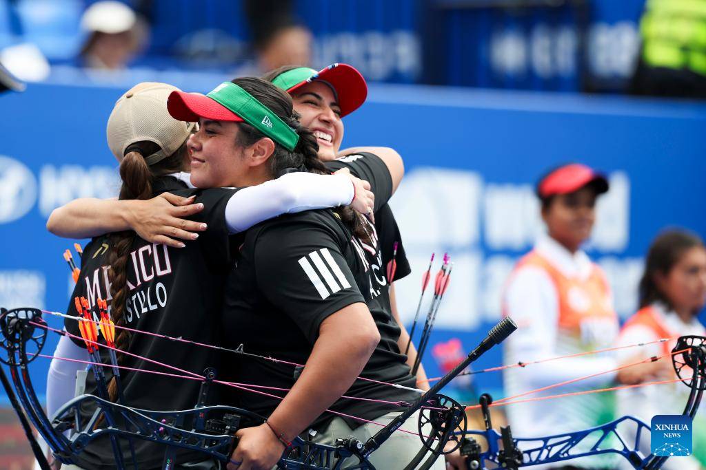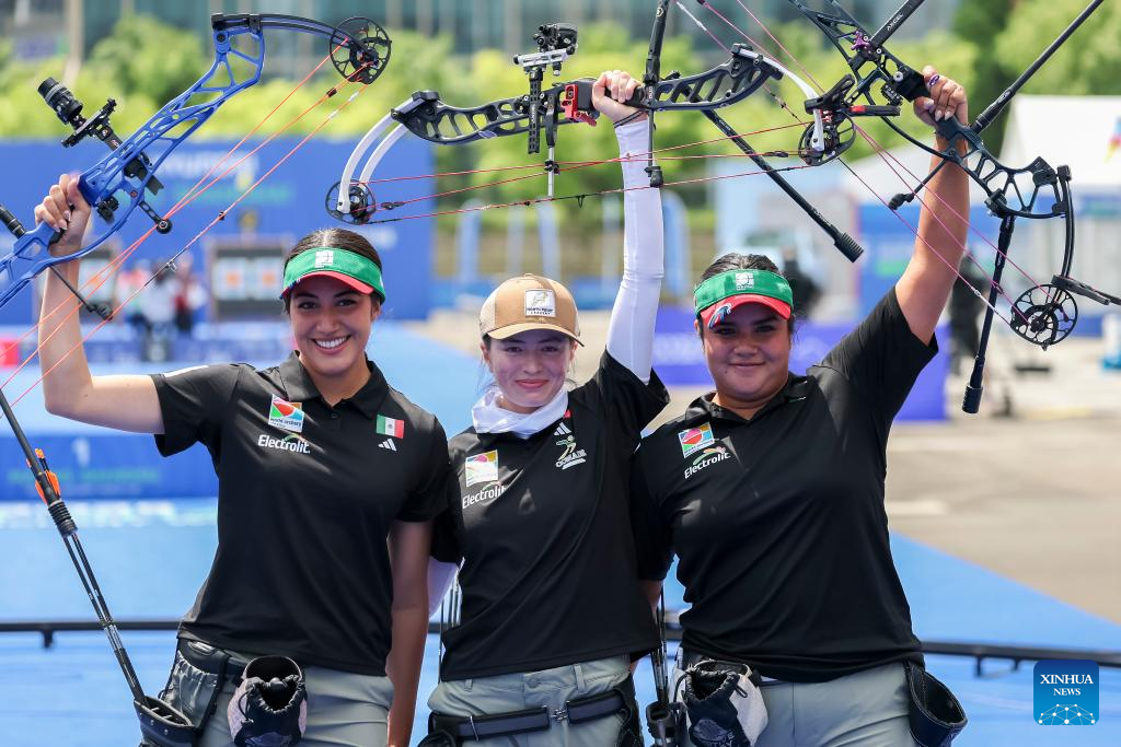 SHANGHAI, 10 mayo, 2025 (Xinhua) -- Miembros del equipo de México festejan al término de la final por la medalla de oro de la competencia de compuesto femenino por equipos en la etapa 2 de la Copa del Mundo de Tiro con Arco de Shanghai 2025, en Shanghai, China, el 10 de mayo de 2025. (Xinhua/Wang Xiang)
