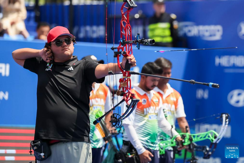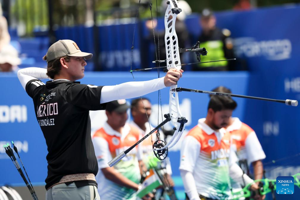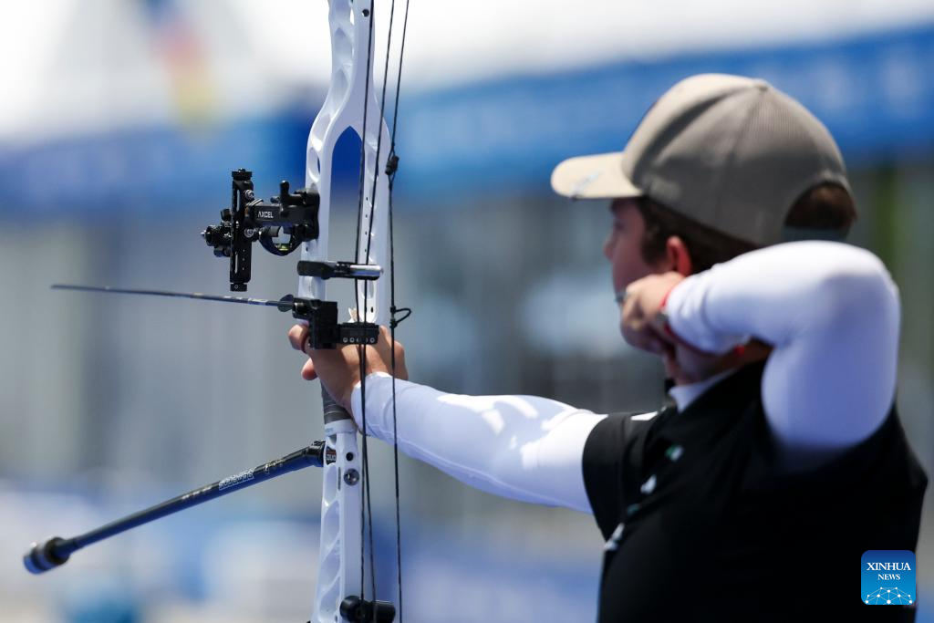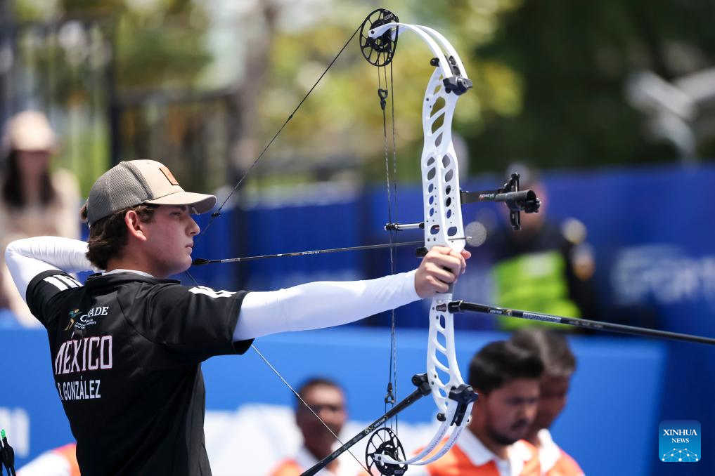 SHANGHAI, 10 mayo, 2025 (Xinhua) -- Rodrigo González, de México, compite durante la final por la medalla de oro de la competencia de compuesto masculino por equipos en la etapa 2 de la Copa del Mundo de Tiro con Arco de Shanghai 2025, en Shanghai, China, el 10 de mayo de 2025. (Xinhua/Wang Xiang)