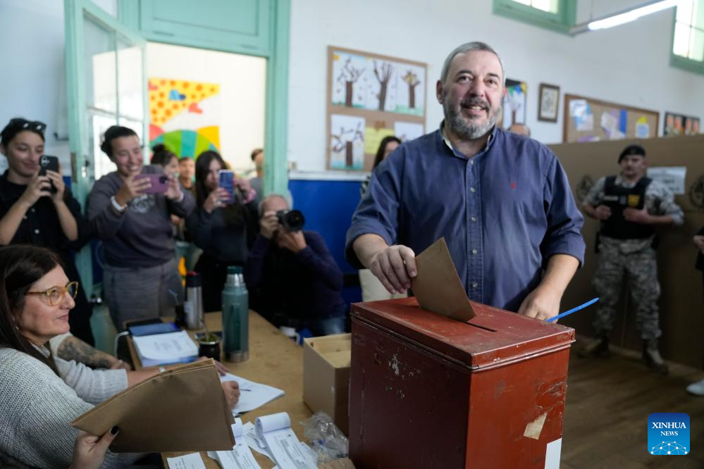MONTEVIDEO, 11 mayo, 2025 (Xinhua) -- El candidato a intendente de Montevideo por el partido oficialista Frente Amplio, Mario Bergara (d-frente), emite su voto en un circuito de votación durante las elecciones departamentales y municipales, en Montevideo, capital de Uruguay, el 11 de mayo de 2025. Las elecciones departamentales en Uruguay transcurren el domingo con normalidad para elegir a los 19 intendentes de los departamentos en los que se divide el país sudamericano y que gobernarán para el período 2025-2030, divulgó la Corte Electoral. (Xinhua/Nicolás Celaya)