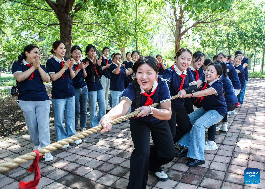 JIAOZUO, 11 mayo, 2025 (Xinhua) -- Imagen del 9 de mayo de 2025 de enfermeras de un centro de salud local participando en una competencia de tira y afloja durante un divertido juego deportivo, en el poblado de Qinghua del distrito de Bo'ai, en Jiaozuo, en la provincia de Henan, en el centro de China. El Día Internacional de las Enfermeras, que se conmemora anualmente el 12 de mayo se ha festejado a través de China en diversas formas. (Xinhua/Cheng Quan)