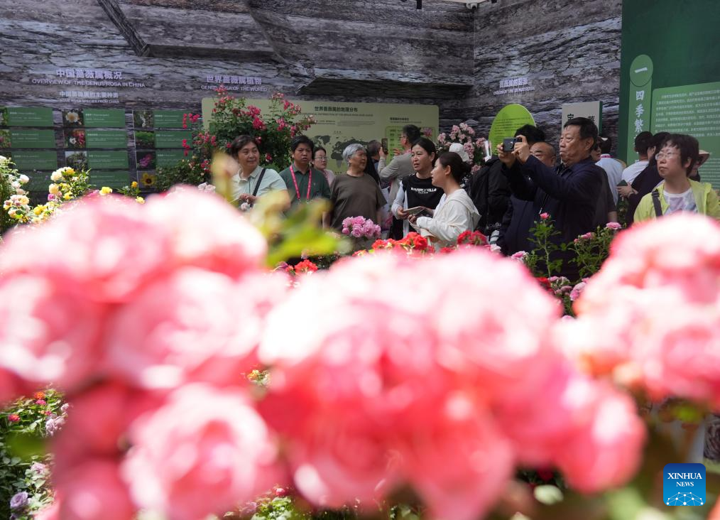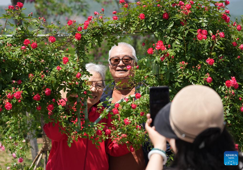 BEIJING, 11 mayo, 2025 (Xinhua) -- Turistas posan para fotografías en el noveno Simposio Internacional sobre Investigación y Cultivo de Rosas, en el distrito de Mentougou, en Beijing, capital de China, el 11 de mayo de 2025. La novena edición del Simposio Internacional sobre Investigación y Cultivo de Rosas, comenzó el sábado aquí y durará hasta el 15 de mayo. Este evento que presenta más de mil variedades de Rosa Chinensis, o Rosa China, de alrededor de todo el mundo, atrajo a un gran número de turistas para venir y disfrutar las flores y divertirse. (Xinhua/Zhang Chenlin)