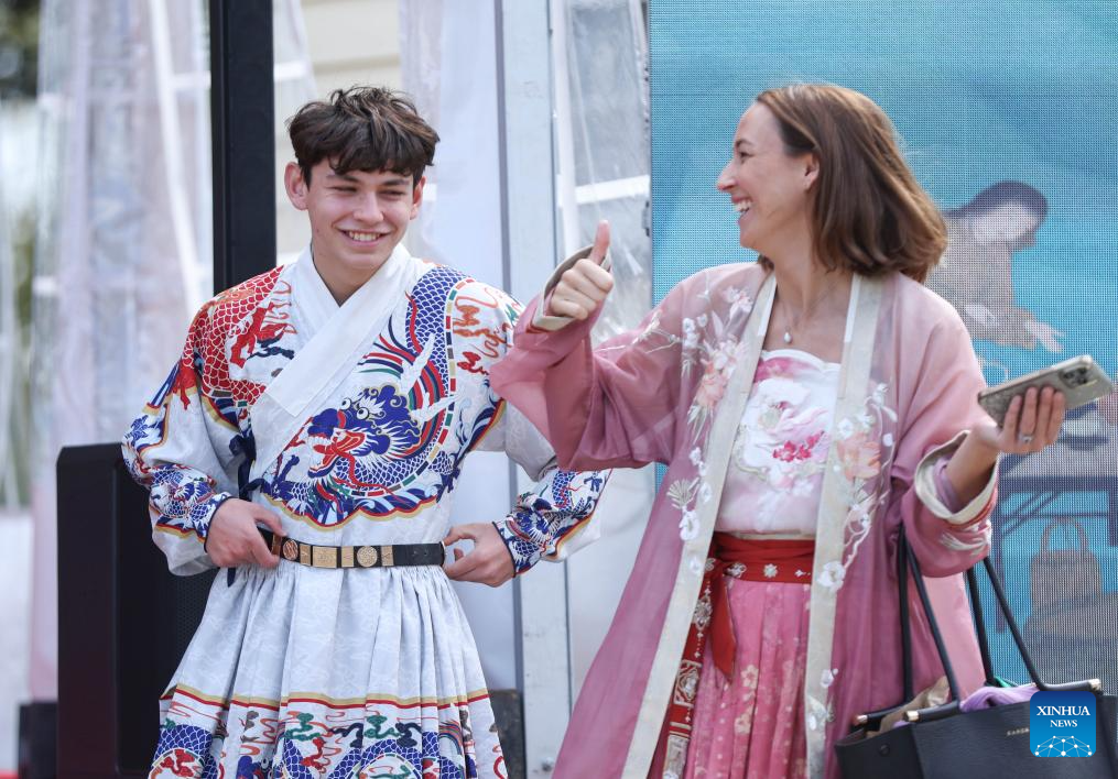 AUCKLAND, 11 mayo, 2025 (Xinhua) -- Personas se prueban atuendos tradicionales chinos durante el salón cultural "Té para la Armonía", en Auckland, Nueva Zelanda, el 11 de mayo de 2025. El salón cultural sobre el té se celebró el domingo en la pintoresca Aldea Histórica de Howick, en Auckland, la ciudad más grande de Nueva Zelanda, invitando a los huéspedes y residentes locales a sumergirse en la riqueza de la cultura tradicional china mientras se promueve el diálogo y la amistad entre China y Nueva Zelanda. (Xinhua/Long Lei)