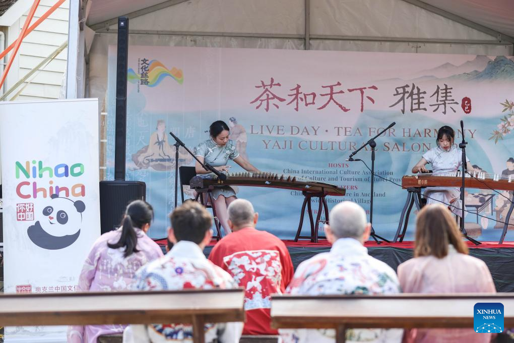 AUCKLAND, 11 mayo, 2025 (Xinhua) -- Personas disfrutan de música folclórica china durante el salón cultural "Té para la Armonía", en Auckland, Nueva Zelanda, el 11 de mayo de 2025. El salón cultural sobre el té se celebró el domingo en la pintoresca Aldea Histórica de Howick, en Auckland, la ciudad más grande de Nueva Zelanda, invitando a los huéspedes y residentes locales a sumergirse en la riqueza de la cultura tradicional china mientras se promueve el diálogo y la amistad entre China y Nueva Zelanda. (Xinhua/Long Lei)