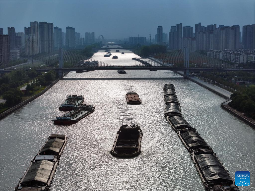HUAI'AN, 12 mayo, 2025 (Xinhua) -- Vista aérea tomada con un dron el 10 de mayo de 2025 de barcos navegando por la sección Huai'an del Gran Canal, en Huai'an, en la provincia de Jiangsu, en el este de China. En los últimos años, Huai'an ha estado construyendo un corredor de 125 kilómetros a lo largo de la vía fluvial del Gran Canal, que hace hincapié en el patrimonio cultural, la preservación ecológica, el crecimiento económico y la habitabilidad. Está previsto que el pintoresco corredor ribereño se convierta en un lugar donde coexistan la naturaleza, el patrimonio y la modernización. (Xinhua/Ji Chunpeng)