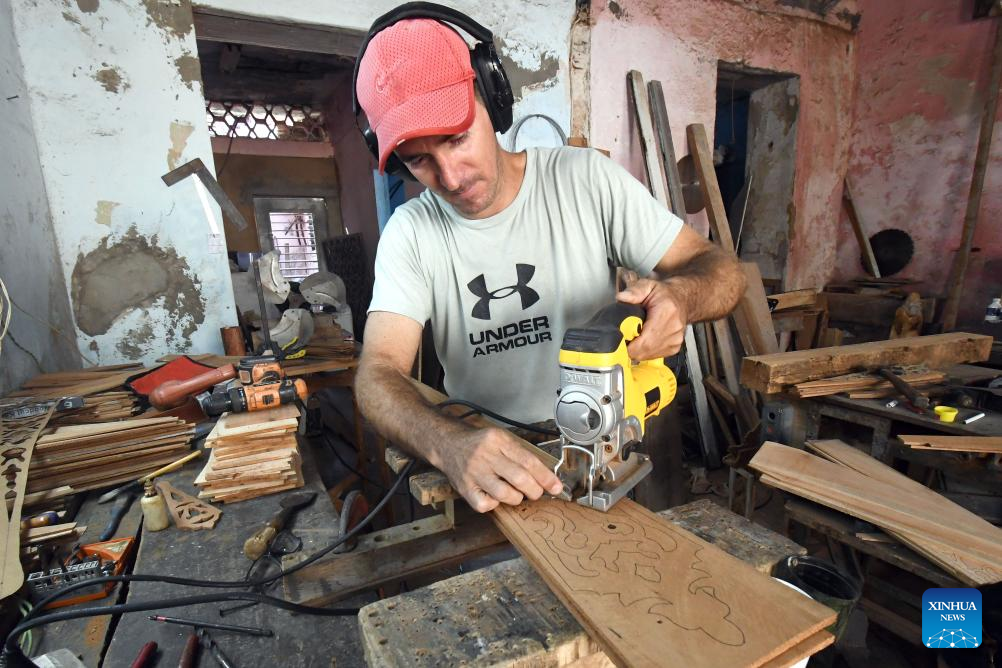 Imagen del 6 de mayo de 2025 del ebanista, José Miguel Rodríguez Cadalso, elaborando abanicos en su taller, en la ciudad de Trinidad, en la provincia de Sancti Spíritus, Cuba. Unos singulares abanicos, elaborados por el ebanista José Miguel Rodríguez Cadalso, engrosan el patrimonio de la centenaria ciudad de Trinidad, punto de atracción turística en el centro-sur de Cuba con una conservada arquitectura que hace que la urbe parezca atrapada en el tiempo. (Xinhua/Joaquín Hernández)