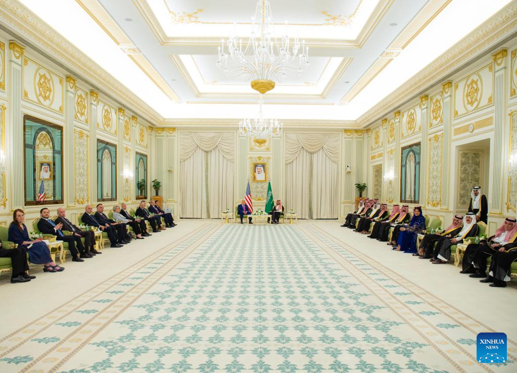 El príncipe heredero y primer ministro saudí, Mohammed bin Salman Al Saud (c-d), se reúne con el visitante presidente estadounidense, Donald Trump (c-i), en Riad, Arabia Saudí, el 13 de mayo de 2025. Trump aseguró el martes en Riad un compromiso de inversión de 600.000 millones de dólares con Arabia Saudí y prometió suspender las sanciones contra Siria. (Xinhua/Saudi Press Agency)