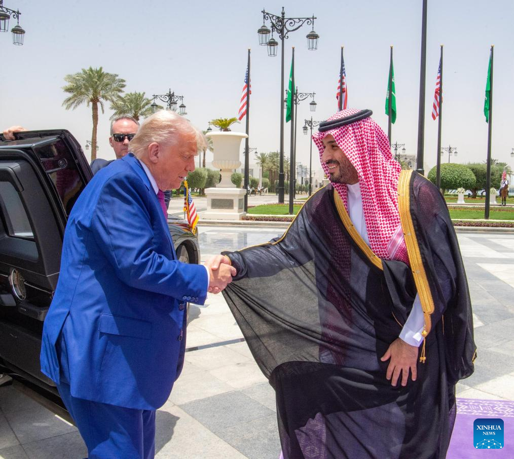 El príncipe heredero y primer ministro saudí, Mohammed bin Salman Al Saud (d), recibe al visitante presidente estadounidense, Donald Trump, en Riad, Arabia Saudí, el 13 de mayo de 2025. Trump aseguró el martes en Riad un compromiso de inversión de 600.000 millones de dólares con Arabia Saudí y prometió suspender las sanciones contra Siria. (Xinhua/Saudi Press Agency)