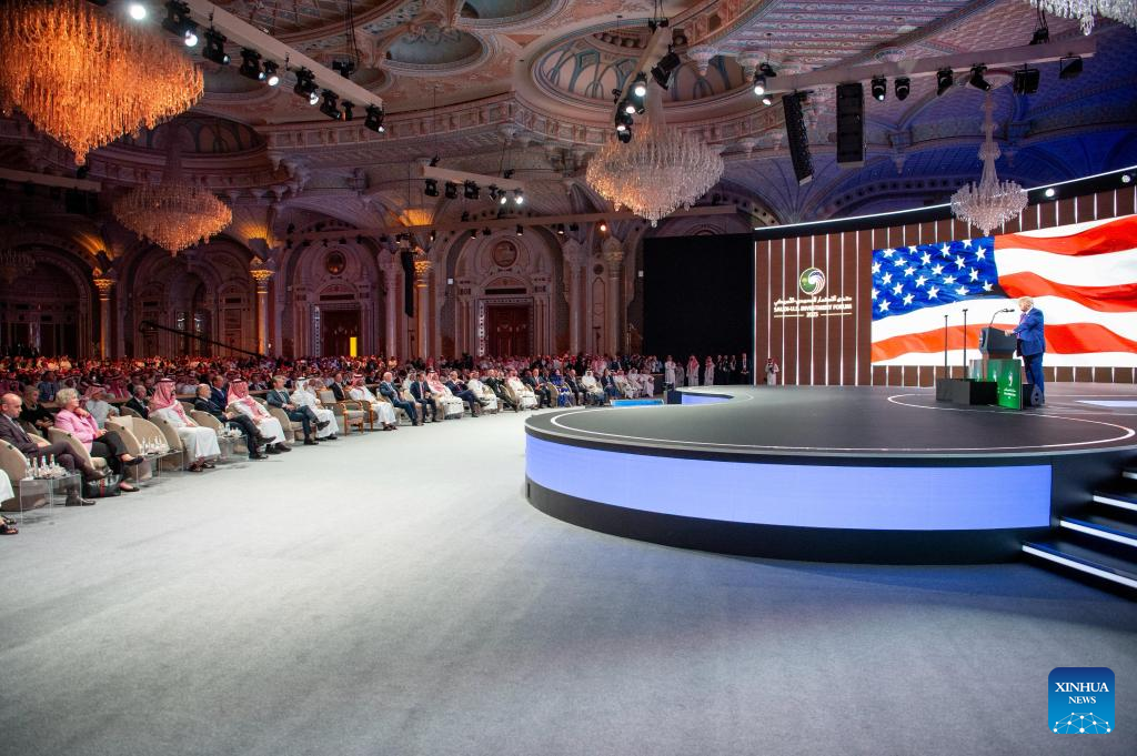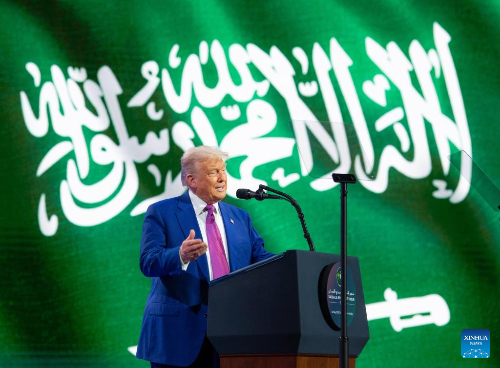 El presidente estadounidense, Donald Trump, habla en un foro de inversión, en Riad, Arabia Saudí, el 13 de mayo de 2025. Trump aseguró el martes en Riad un compromiso de inversión de 600.000 millones de dólares con Arabia Saudí y prometió suspender las sanciones contra Siria. (Xinhua/Saudi Press Agency)
