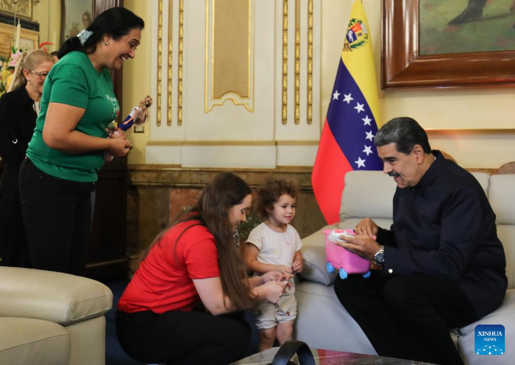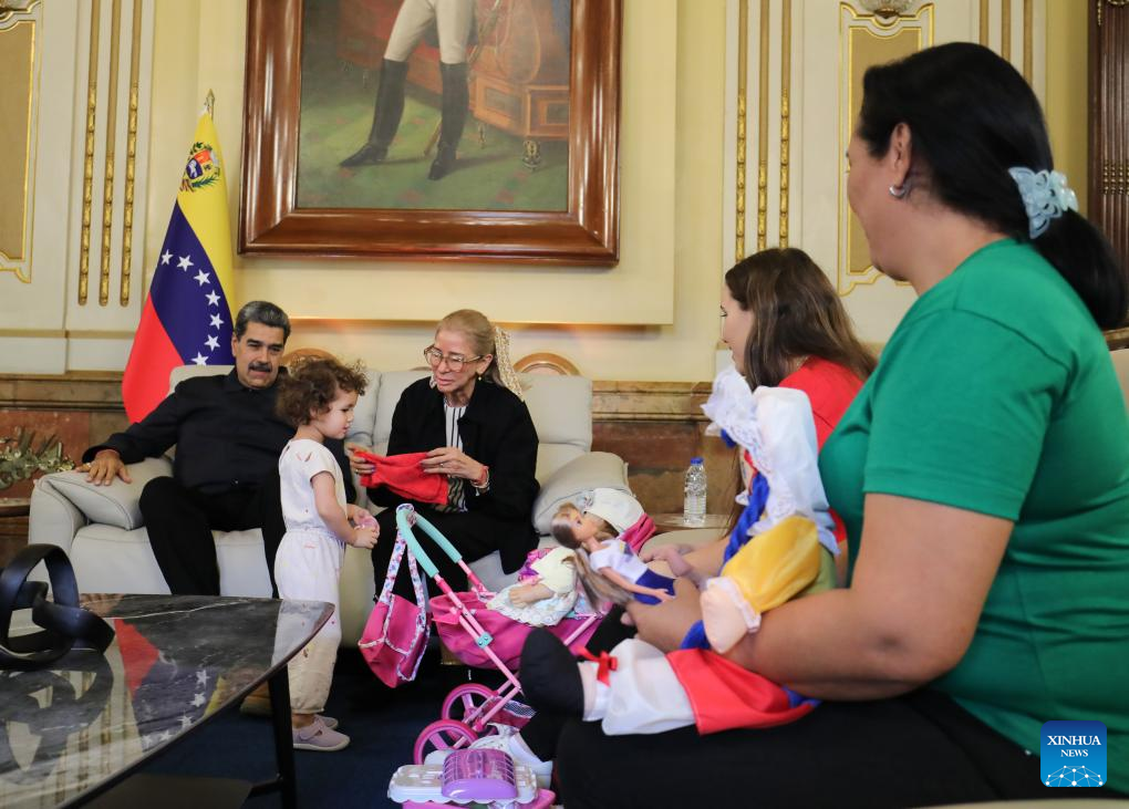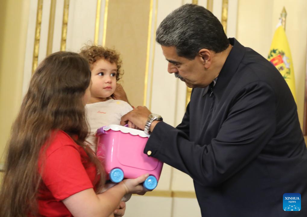 CARACAS, 14 mayo, 2025 (Xinhua) -- Imagen cedida por la Presidencia de Venezuela del presidente venezolano, Nicolás Maduro (i), recibiendo a la niña Maikelys Espinoza (2-i) junto a sus familiares en el Palacio de Miraflores, en Caracas, Venezuela, el 14 de mayo de 2025. Maduro afirmó el miércoles que el retorno a territorio venezolano de la niña Maikelys Espinoza, de dos años de edad y quien se encontraba retenida por autoridades estadounidenses, es una victoria del pueblo y agradeció también al presidente de Estados Unidos, Donald Trump, por haberlo facilitado. (Xinhua/Presidencia de Venezuela)