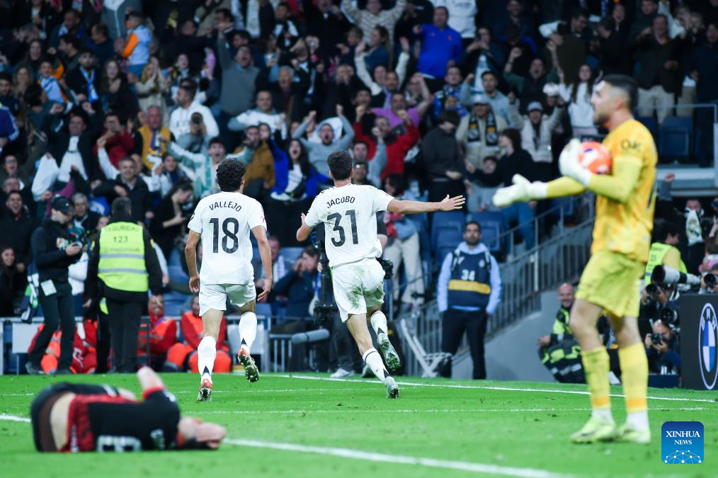 MADRID, 15 mayo, 2025 (Xinhua) -- Imagen del 14 de mayo de 2025 de Jacobo Ramón (c), de Real Madrid, festejando su anotación durante el partido de fútbol de LaLiga entre Real Madrid y RCD Mallorca, en Madrid, España. (Xinhua/Gustavo Valiente)