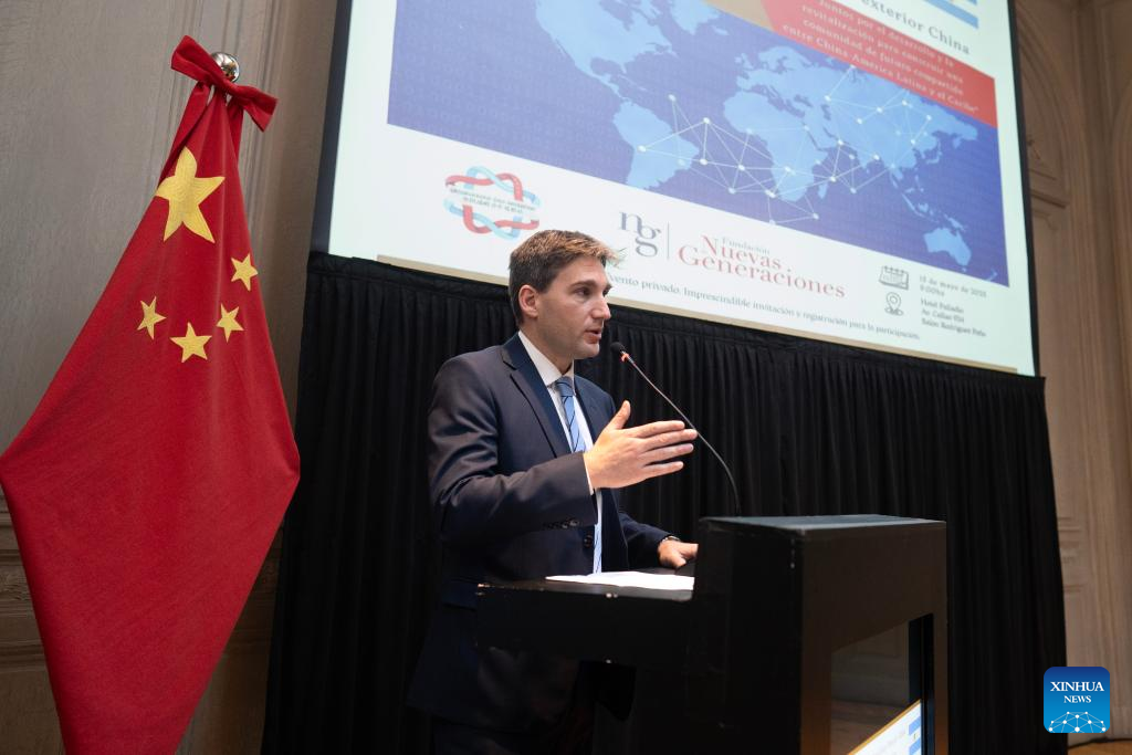BUENOS AIRES, 16 mayo, 2025 (Xinhua) -- Imagen del 15 de mayo de 2025 del director ejecutivo del Observatorio Sino-Argentino, Patricio Giusto, hablando durante una jornada sobre la política exterior china bajo el lema "Juntos por el desarrollo y la revitalización para construir una comunidad de futuro compartido entre China-América Latina y el Caribe", en la ciudad de Buenos Aires, capital de Argentina. Académicos y diplomáticos destacaron el jueves en la ciudad argentina de Buenos Aires la importancia de China para el desarrollo de América Latina y el Caribe, en el marco de la construcción de una comunidad de futuro compartido entre las partes. (Xinhua/Martín Zabala)