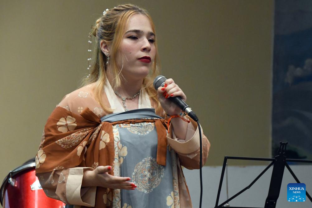 La estudiante Alexandra García, ganadora de la final en la categoría de universitarios, realiza una interpretación en el Concurso Puente Chino, en La Habana, capital de Cuba, el 16 de mayo de 2025. Los jóvenes Alexandra García, en la categoría de universitarios, y Marcel Curbelo, entre los estudiantes de nivel medio de la enseñanza general, resultaron los ganadores en la final del Concurso Puente Chino en Cuba. (Xinhua/Joaquín Hernández)