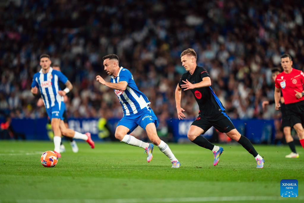 BARCELONA, 16 mayo, 2025 (Xinhua) -- Imagen del 15 de mayo de 2025 de Frenkie De Jong (i), de FC Barcelona, disputando el balón con Edu Expósito, de RCD Espanyol, durante el partido de fútbol de la Laliga entre FC Barcelona y RCD Espanyol, en el RCDE Stadium, en Cornellá, España. (Xinhua/Joan Gosa)